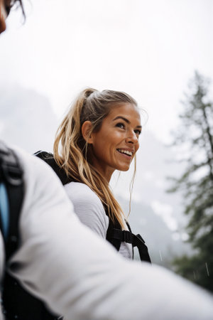 Happy Hiker Enjoying the Adventure in the Mountains With a Friend on a Rainy Day