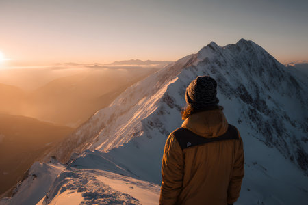 A hiker stands on a rocky peak, gazing at a breathtaking sunset over snow-covered mountains. Soft light illuminates the valley below, creating a serene atmosphere.