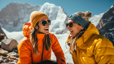 Two female friends hiking in the mountains. Outdoor lifestyle portrait of two women in warm jackets and hats.