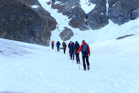 group of mountaineers with backpacks goes along the snowy slope of the mountain