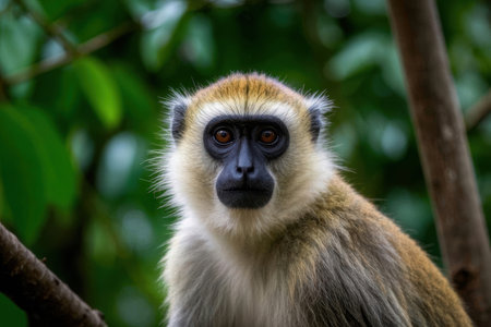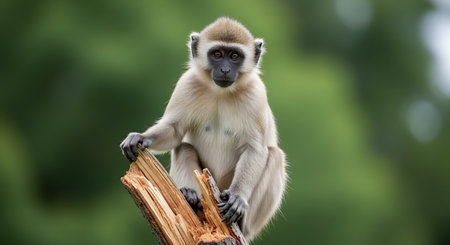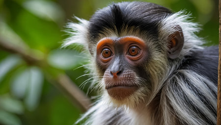 Adorable monkey with bright eyes and fluffy fur, showing curiosity and playfulness while resting in a lush green habitat.