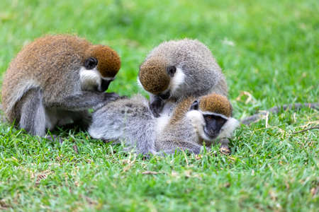 cute vervet monkey in social Grooming. Chlorocebus pygerythrus in Hawassa - Awasa city park, Ethiopia wildlife
