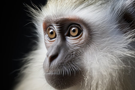 A close-up portrait of a monkey with bright eyes and detailed fur, capturing its expressive and curious look