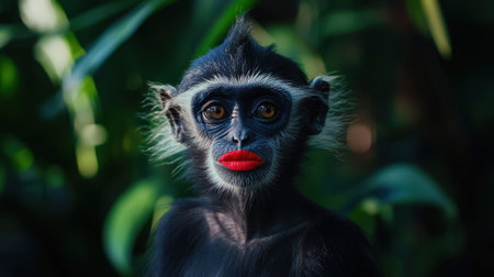 A monkey exhibiting striking red lips poses amid vibrant greenery in a tropical setting. The animal's expressive eyes create an engaging focal point in this natural habitat.