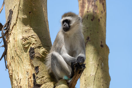 A vervet monkey, Chlorocebus pygerythrus, on a tree branch