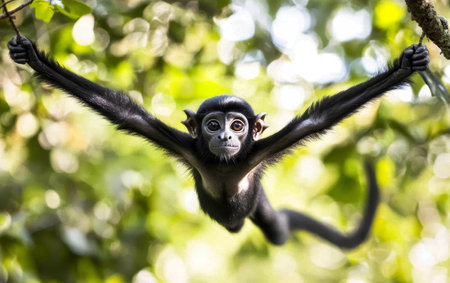 An energetic gibbon with outstretched arms swings between tree branches, its expressive face and agile body capturing the joy and freedom of life in the forest canopy.