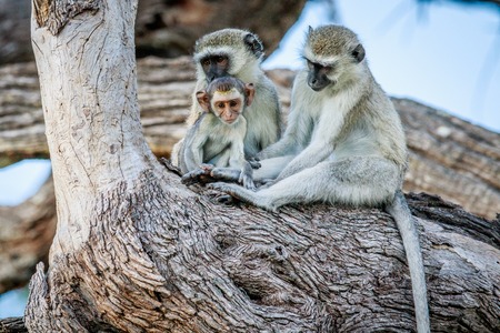 Family of Vervet monkeys sitting in a tree in the Chobe National Park, Botswana.