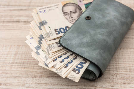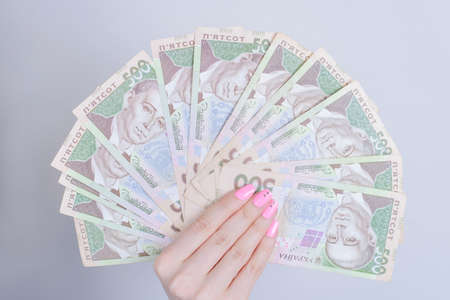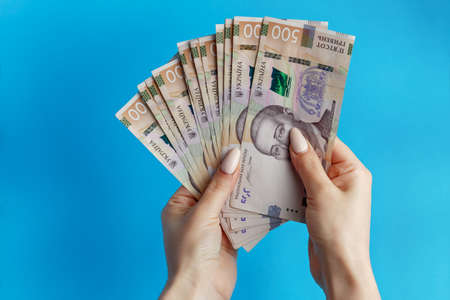Female hands hold ukrainian money currency. Several thousand hryvnia banknotes by 500. Money of Ukraine.