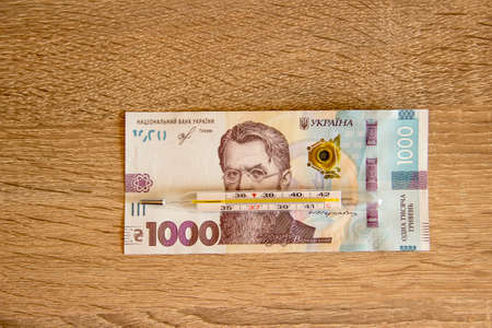 Fun from new Ukrainian banknotes face value 1000 hryvnia. Paper money on wooden background with copy cpace or textspace at left side. Close up shot. Wealth concept.