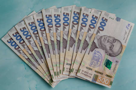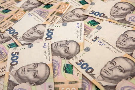 Ukrainian Money backgrounds. 500 banknotes. Hryvnia (UAH). Top view.