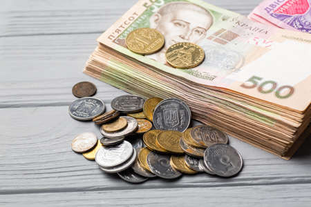 Money of Ukraine. Stack of ukrainian hryvnia banknotes with different small coins on gray wooden table
