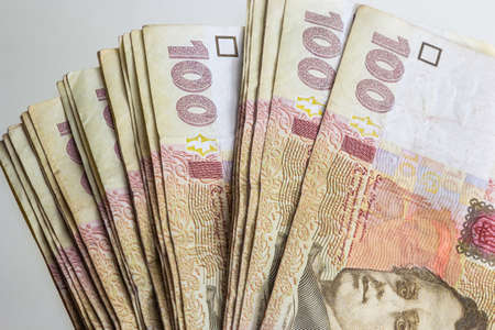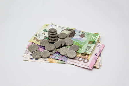 Ukrainian money. Ukrainian money lies on a white background. ukrainian hryvnia concept of finance and banking. European currency