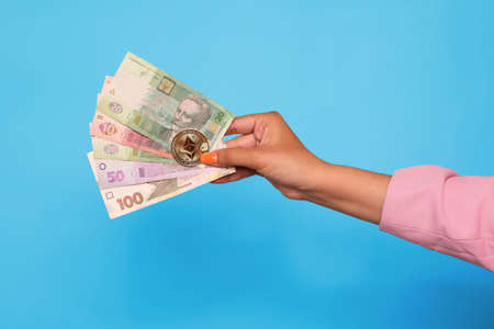 Hand holding ukrainian hryvnia and ethereum over blue background