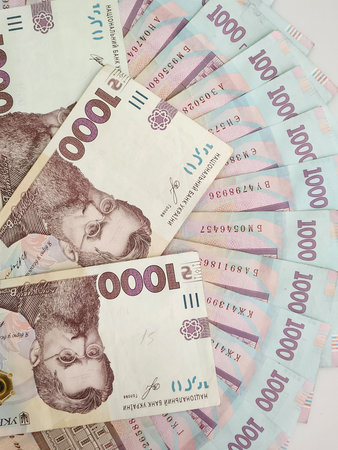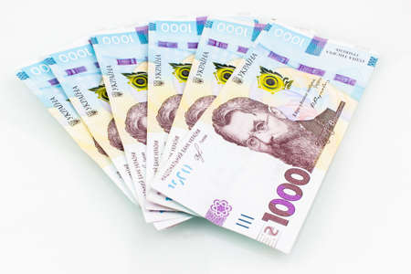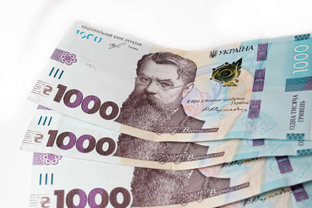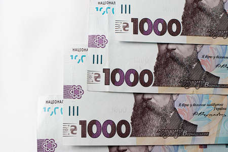 Close up 1000 Ukrainian money hryvnia on white background. Business flat lay with copy space for text. Crisis and problem of financial turbulence, inflation, devalvation, economics depression.