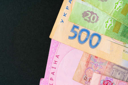 A lot of Ukrainian hryvnias, face value 500 hryvnias on a black background, nicely laid out money on black.2020
