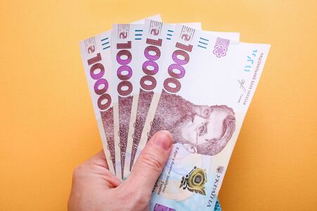 New Ukrainian banknotes thousand hryvnias in a female hand on an orange background.