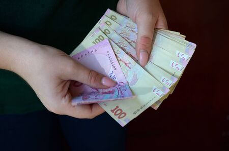 Female hands counts big amount of ukrainian money during salary period in Ukraine. Rich life concept