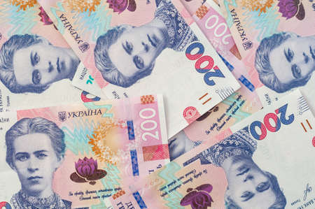 Paper money, Ukrainian hryvnia in denomination 200 hryvnia, new money, background with scattered banknotes