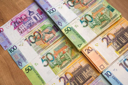Belarusian paper money on wooden background. many colored currency of different denominations. Banknotes of the Republic of Belarus.