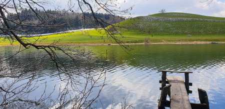 A serene landscape capturing the beauty of calm water reflecting a blue sky and green hills, inviting viewers to experience tranquility and natural wonder.