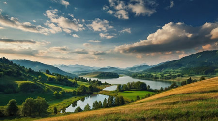 A serene view of a mountain lake reflects the lush green hills and bright blue sky, creating a peaceful and tranquil summer landscape perfect for nature lovers.