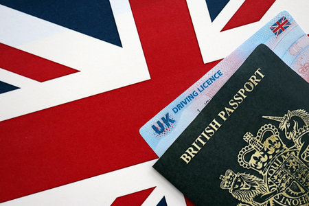 On a white background is the flag of Great Britain, on it lies a red heart. Patriotism