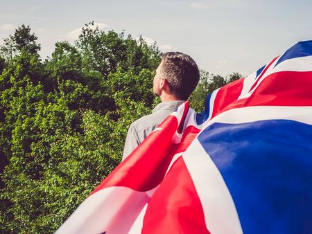 Attractive man waving a British Flag against a background of trees and blue sky. View from the back, close-up. National holiday concept