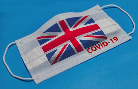 Medical face mask with flag of Britain and COVID-19 text on blue background. Concept of coronavirus quarantine.