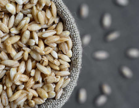 grain barley in flax sack on grey background