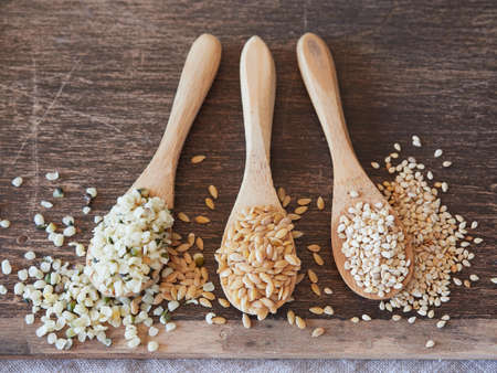 Three wooden taaspoons with hemp seed, golden flax and sesame seeds. Top view, close-up.
