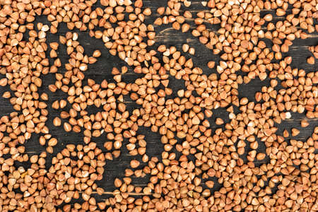Scattered uncooked grains of buckwheat on a wooden background, top view