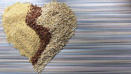different types of nutritious cereals scattered on a striped heart-shaped surface to symbolize healthy eating