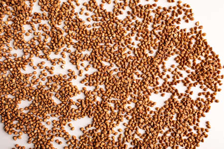 Close up of buckwheat grains isolated on white background. Top view