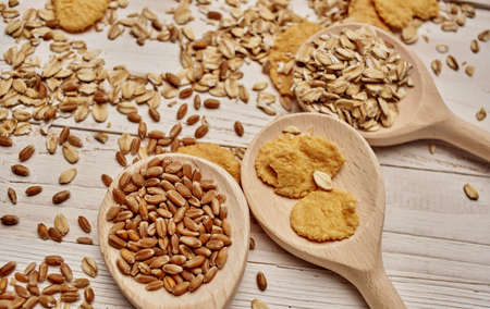 wheat and cereal scattered on the table wooden spoons kitchen board