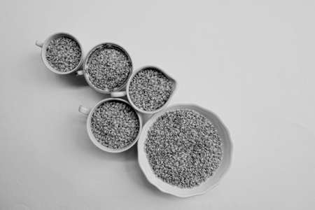 Millet, rice, buckwheat, pearl barley in the laboratory for food quality control of grain crops. Various varieties of cereals in a food laboratory.