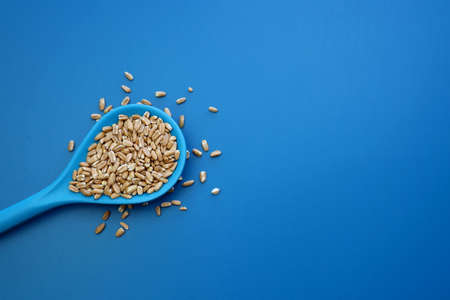 Spelled groats in a blue spoon on a blue background.