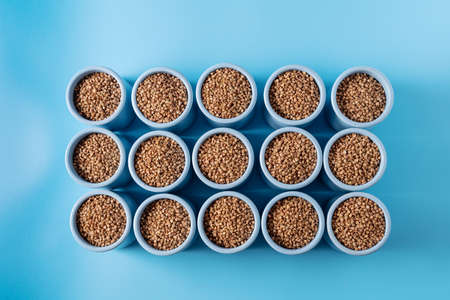 Top view dry organic buckwheat in bowls on blue background,flat lay.