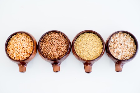 different types of groats in pots on a white background