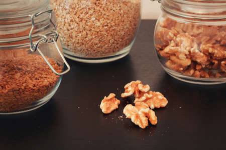Healthy food, nuts, linseed and oats in glass jars