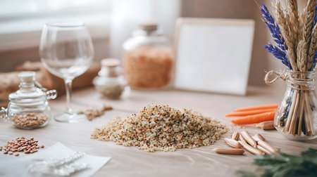 Raw Whole Grain Texture A close shot of raw whole grains tered on a smooth surface with different shapes and colors blending together showcasing their natural state..