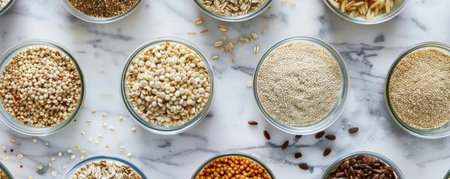 A top-down view of an assortment of groats spread across a kitchen counter, featuring quinoa, barley, and buckwheat in different containers.