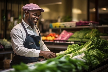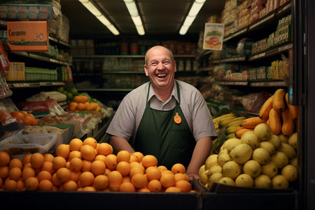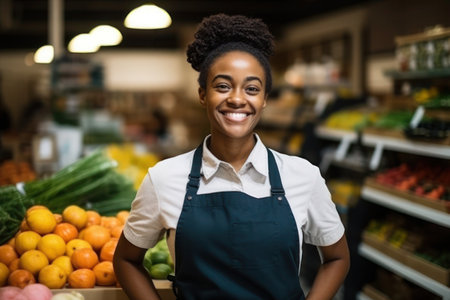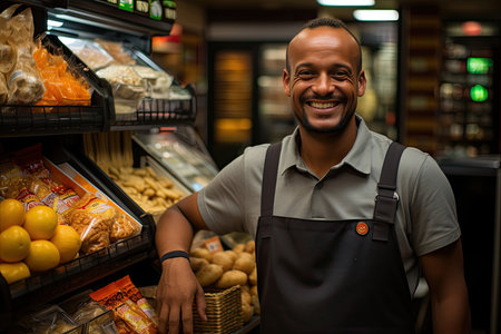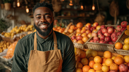 a smiling african american grocer stands proudly in his local market surrounded by fresh fruits, promoting healthy eating habits and local business