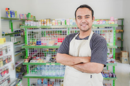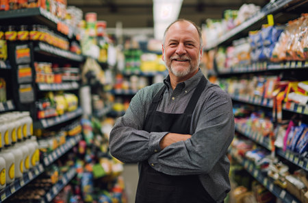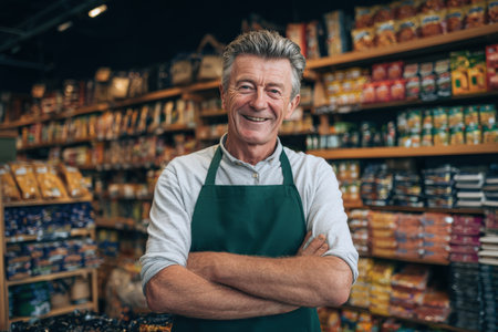 Older male shopkeeper, dressed in green apron, smiles warmly in grocery store, surrounded by shelves stocked with diverse food items, creating an inviting environment