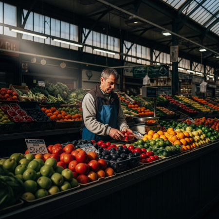 Market vendor arranging fresh vegetables and fruits in colorful crates at local market in the afternoon
