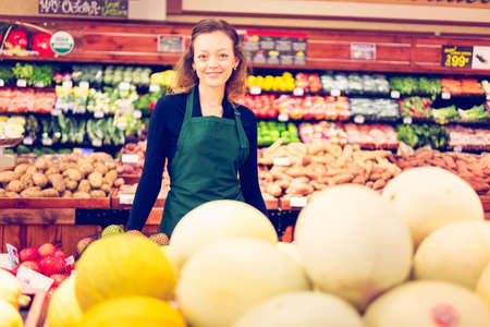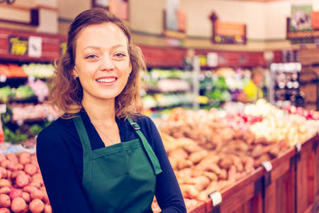 smiling female working in a modern grocery store