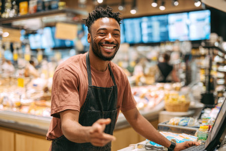 A smiling young man wearing an apron stands in a brightly lit supermarket. He is gesturing with his hand and appears to be interacting with customers. The scene features a variety of food displays and products, captured with a natural composition and warm lighting, suitable for diverse commercial uses.