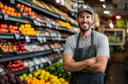 A smiling grocery store employee standing in front of stocked shelves, reflecting a positive and friendly retail environment. Perfect for business, service, and customer care themes.