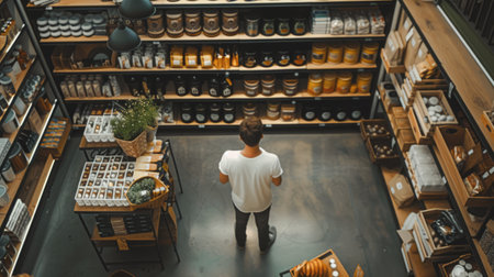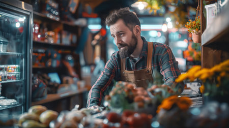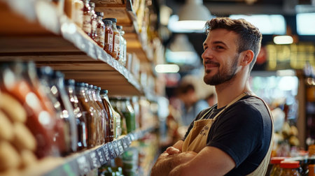 A man working in a bustling food market, surrounded by shelves and customers. The image highlights themes of food market, commerce, and customer service.