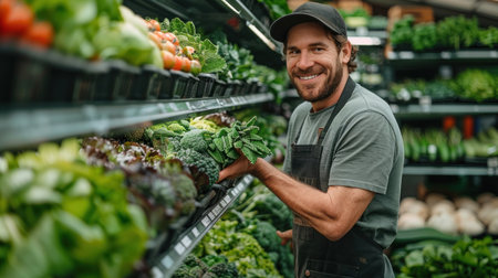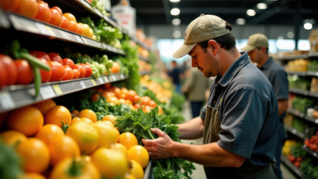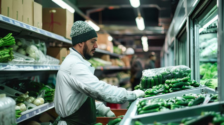 Fresh organic supermarket, A worker repacking shelves at the veggie department aisle, AI Generative.