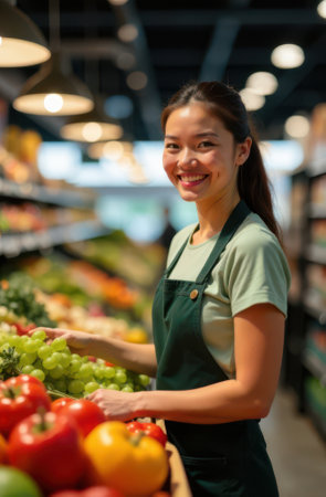 Young female greengrocer smiling and arranging fresh green grapes on a shelf, working in the fruit and vegetable section of a brightly lit supermarket, surrounded by colorful produce